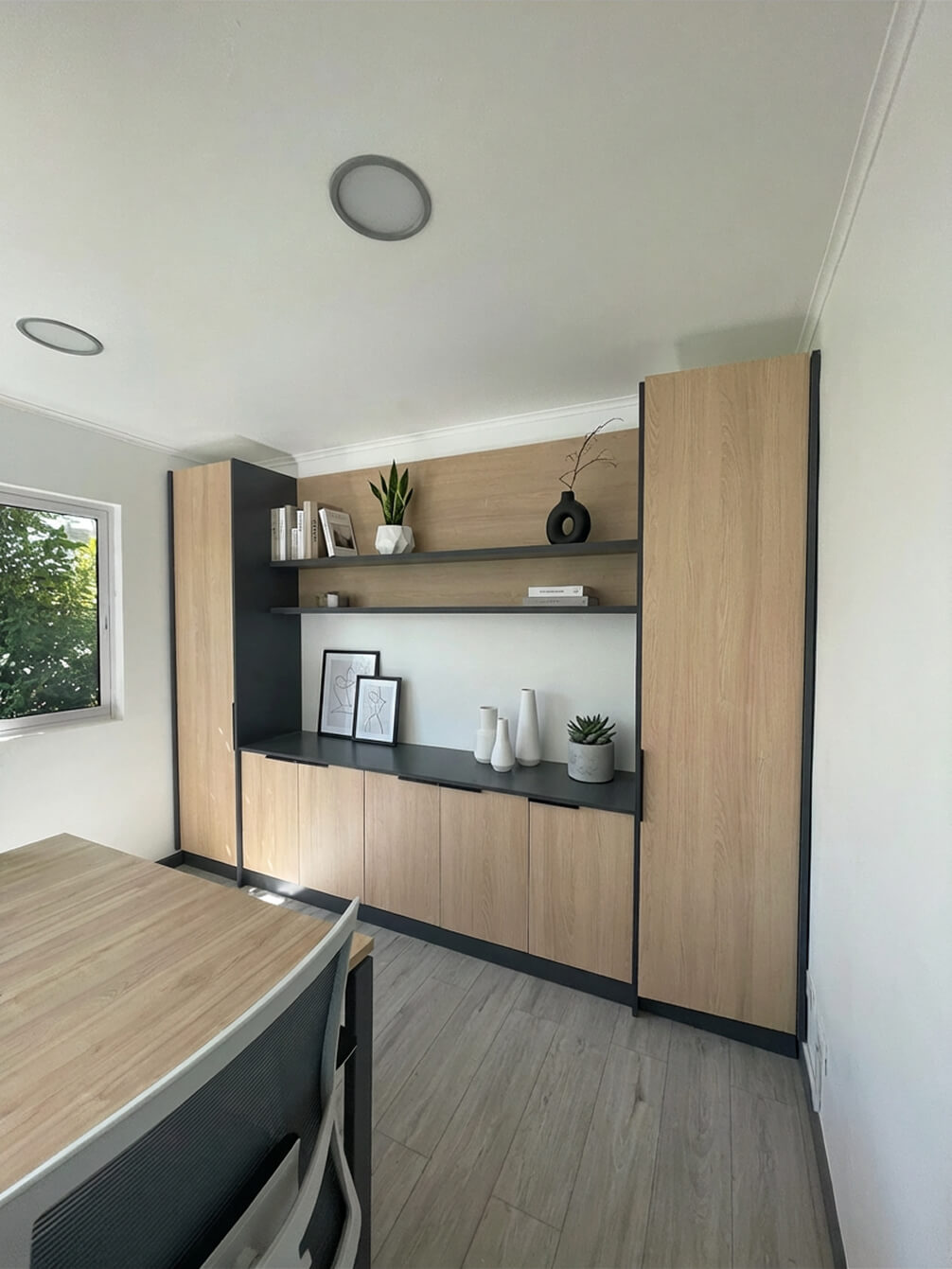 Las Oficinas de Trabajo – Dirección de Postgrado son espacios sobrios y funcionales, diseñados bajo una paleta de tonos neutros que favorecen la concentración y la productividad. El hall de acceso, optimizado al máximo, integra un estar con kitchenette y mesón de recepción que articula el recorrido, transmitiendo orden, profesionalismo y calidez desde el primer contacto.A luxurious hotel lounge curated for high-profile events and guest relaxation. The space features plush furnishings, artisan-crafted details, and ambient lighting to create a warm and welcoming hospitality environment.